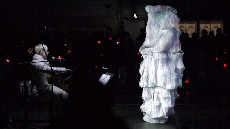 COCON is an installation and concert experience. Dyane Donck composer and visual artist Iris Bouwmeester bring installation art, performance and contemporary music like never before. In a darkened room, a sculpture slowly comes to life. Shape, color and atmosphere changes dramatically. The atmospheric film images of Ruud Terhaag makes COCON complete.